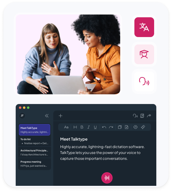 For international students, dictating notes in English with TalkType can be easier than typing. It enables you to quickly capture your thoughts without concerns about spelling and grammar.