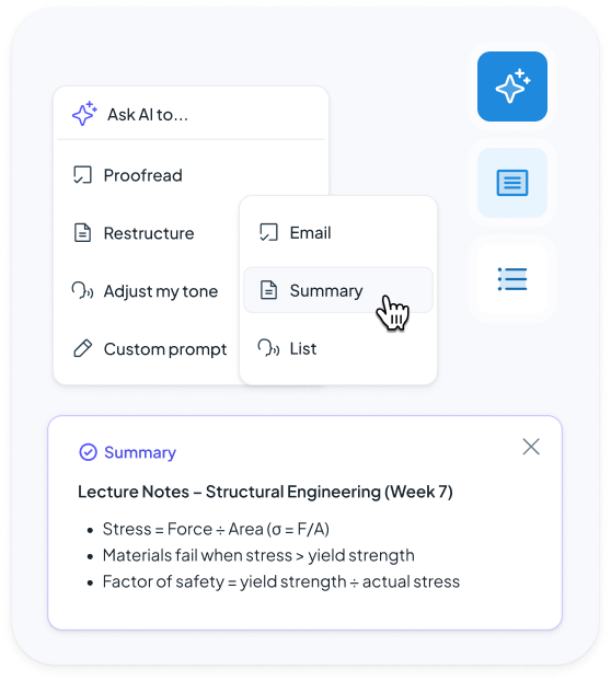 Don’t waste time on tedious summaries. Use our AI tools to condense long notes into key points or structure your writing.